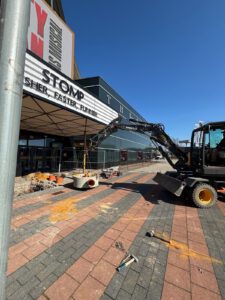 Am Metronom Theater Oberhausen durften wir kürzlich ein sehr spannendes Tiefbauprojekt umsetzen: den Neubau eines Revisionsschachts direkt im Bereich vor dem Haupteingang. Allein die Lage hat das Ganze besonders gemacht. Der Eingangsbereich eines Theaters ist kein klassischer Baustellenort, sondern ein stark frequentierter Bereich, der eine saubere Planung und enge Abstimmung